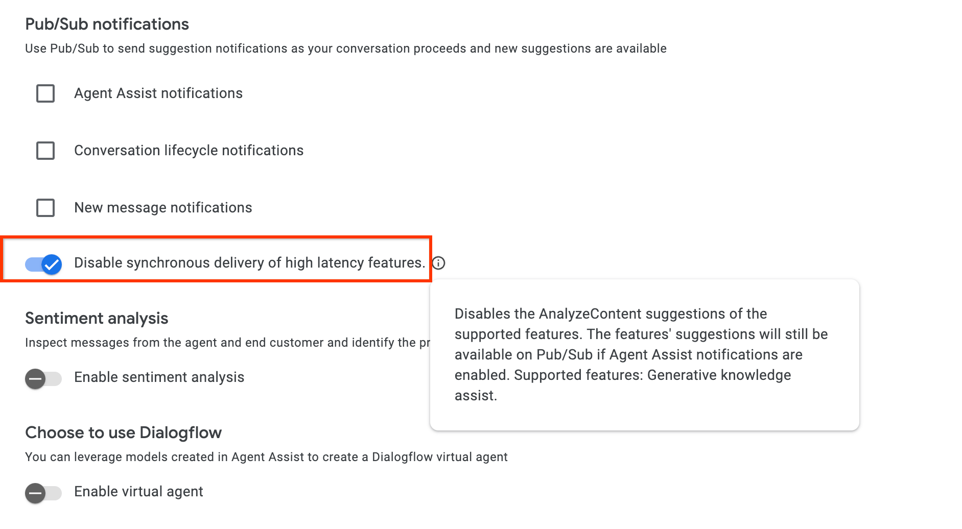 If you're integrating through the AnalyzeContent API, you have the option to enable the disable_high_latency_features_sync_delivery config in ConversationProfile to ensure that the AnalyzeContent API will respond, without waiting for the proactive generative knowledge assist suggestions, and deliver the suggestions through Pub/Sub.