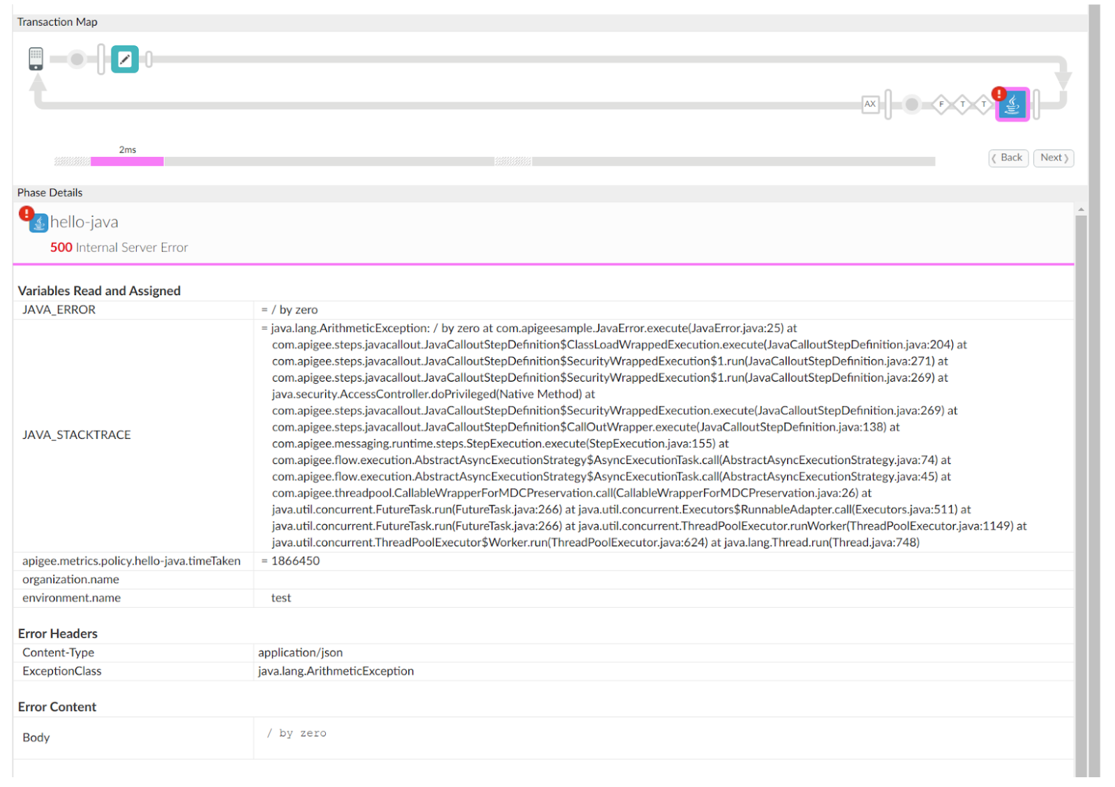 In this example, the JavaCallout policy failed due to an ArithmeticException (division by zero) in the