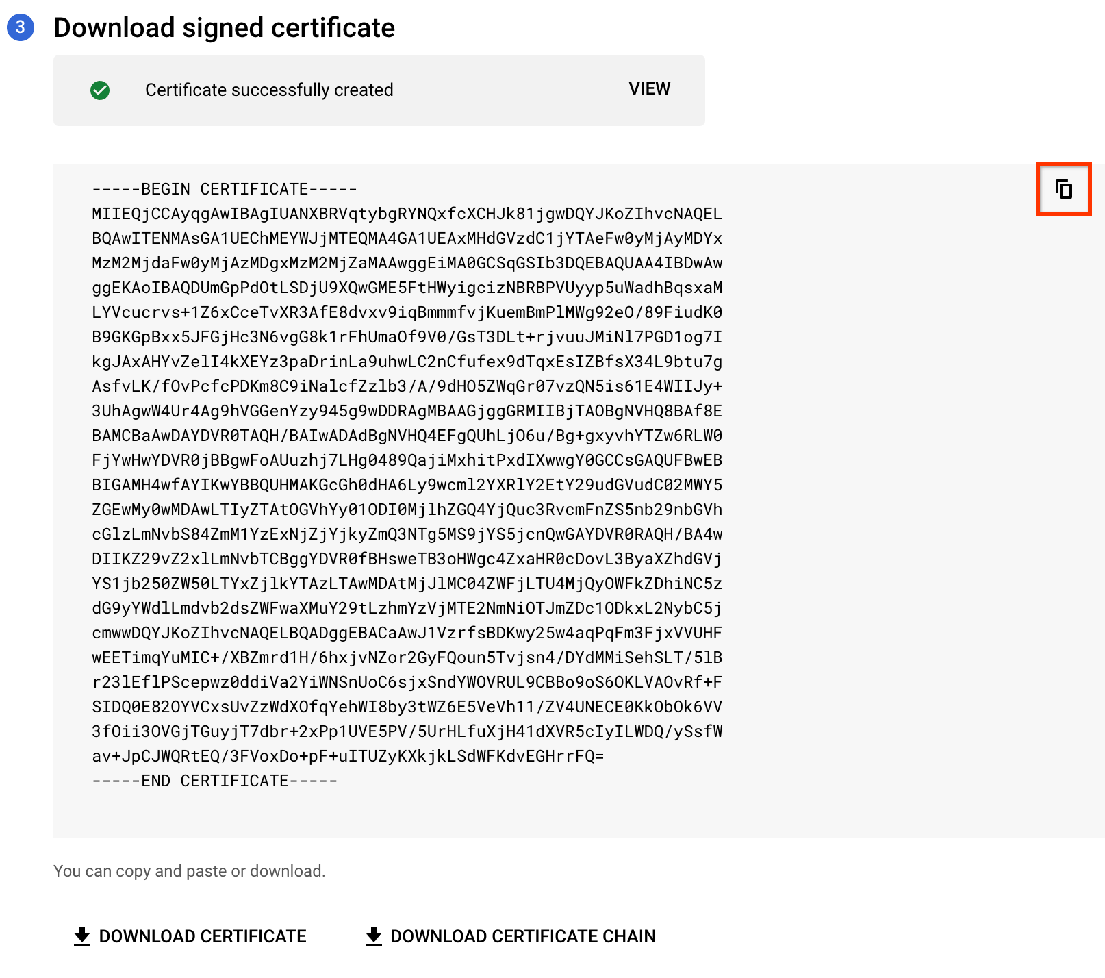 You will see the generated certificate that you can copy or download. To copy the certificate, click .