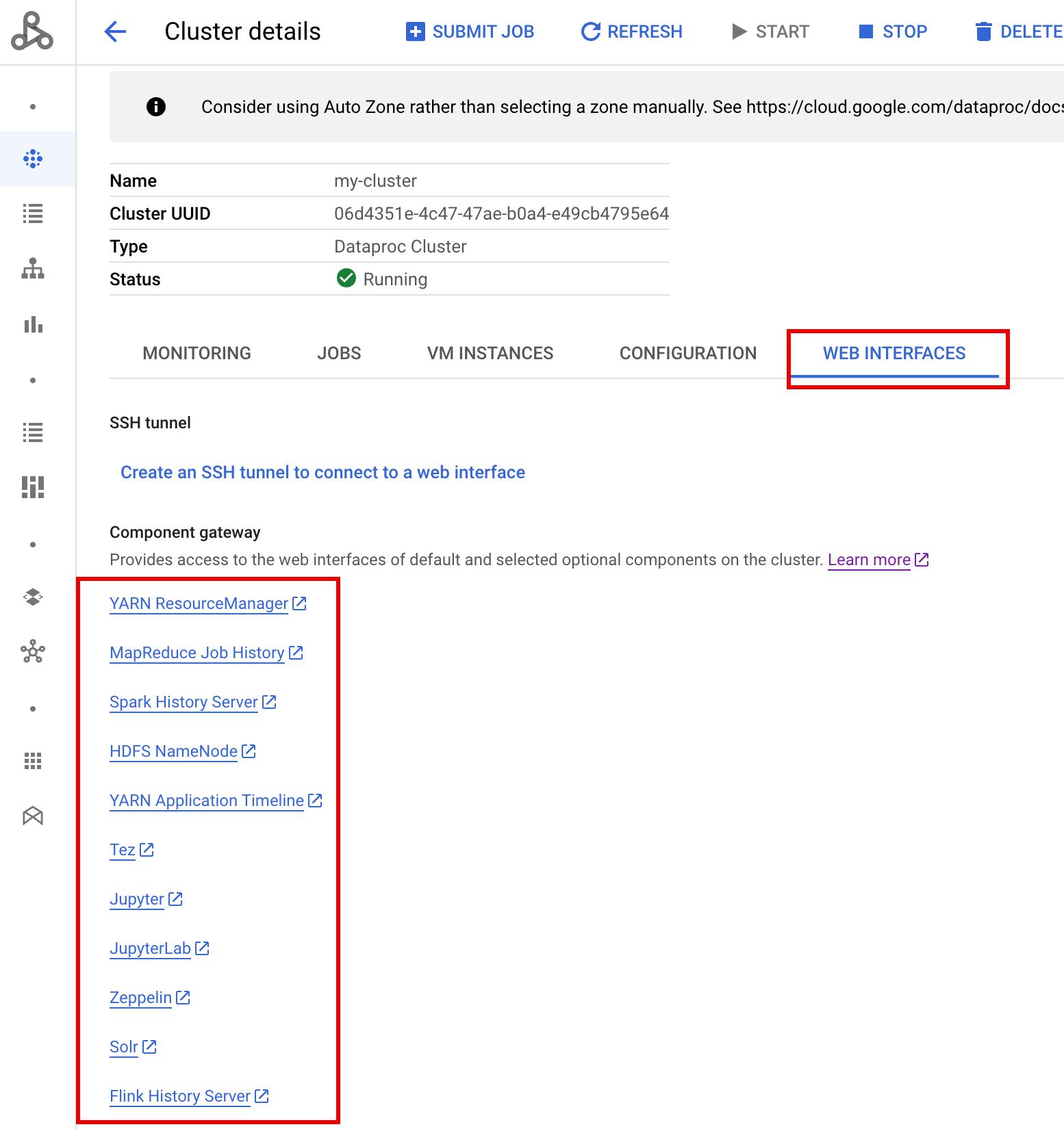 After the cluster is running, navigate to the Dataproc Clusters page on Google Cloud console, then select the cluster's name to open the Cluster details page. Click the Web Interfaces tab to display a list of Component Gateway links to the web interfaces of default and optional components installed on the cluster. Click the Ranger link.