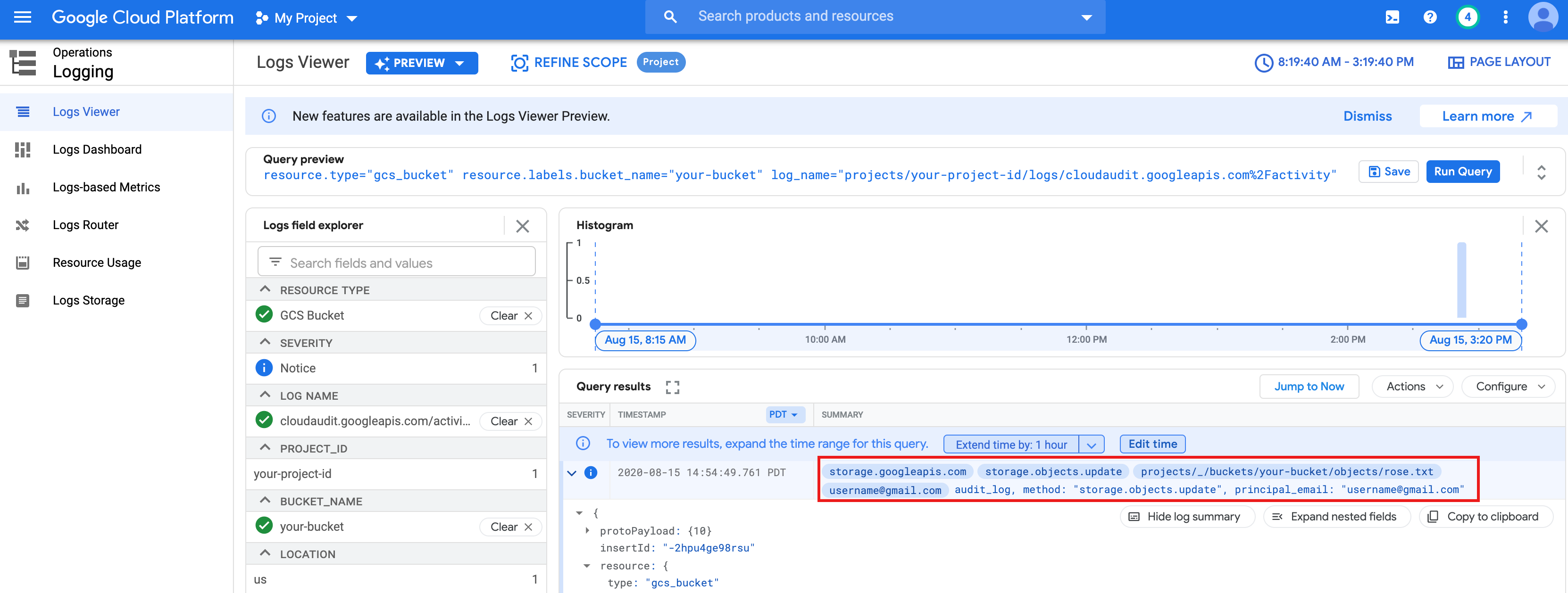 rose.txtfile you created above. Spark is able to read thetext_file = sc.textFile("gs://bucket-name/rose.txt") counts = text_file.flatMap(lambda line: line.split(" ")) \ .map(lambda word: (word, 1)) \ .reduceByKey(lambda a, b: a + b) print(counts.collect())rose.txtfile in Cloud Storage because it runs with your user credentials.You can also check the Cloud Storage Bucket Audit Logs to verify that the job is accessing Cloud Storage with your identity (see Cloud Audit Logs with Cloud Storage for more information).