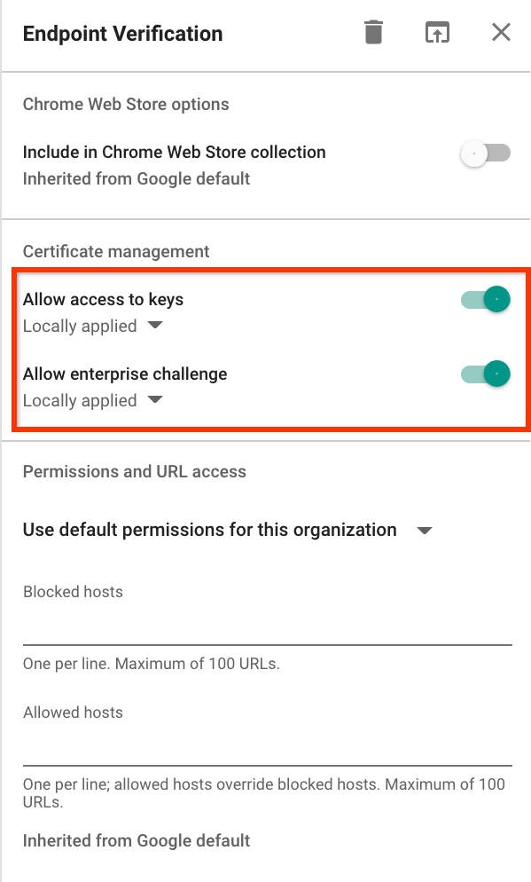- Allow access to keys: allows the Endpoint Verification extension to access client certificates and keys on ChromeOS.