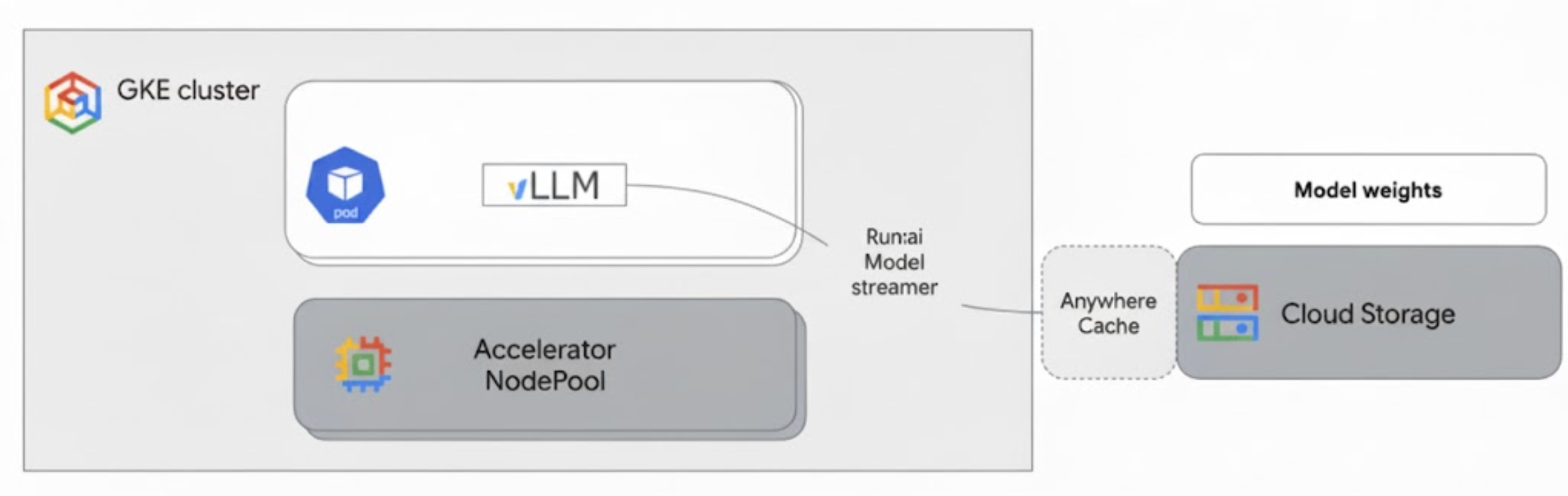 gs://path in the Cloud Storage bucket. Instead of downloading files to disk, it streams tensor data directly into the GPU memory of the GKE Pod, where it's immediately available to vLLM for inference. - Cloud Storage Anywhere Cache (Optional): if enabled, Anywhere Cache caches bucket data in the same zone as the GKE nodes, further accelerating data access for the streamer.