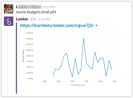movie budgetswith the valueBrad Pitt, Slackbot responds with a link to the Looker query and a line chart visualization that depicts the increasing and decreasing value trends of the average Brad Pitt movie budget from 0 to 160 million for a movie's first release year, ranging from 1990 to 2015: