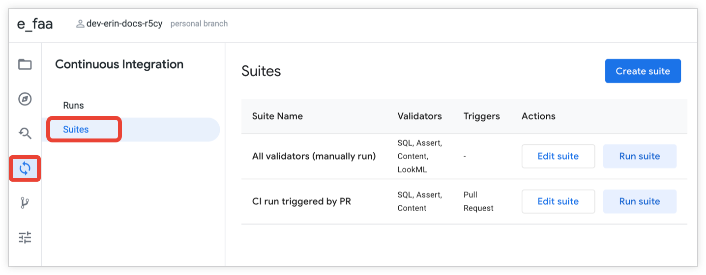 - Manually, using the Run suite button on the Suites page in the Looker IDE.