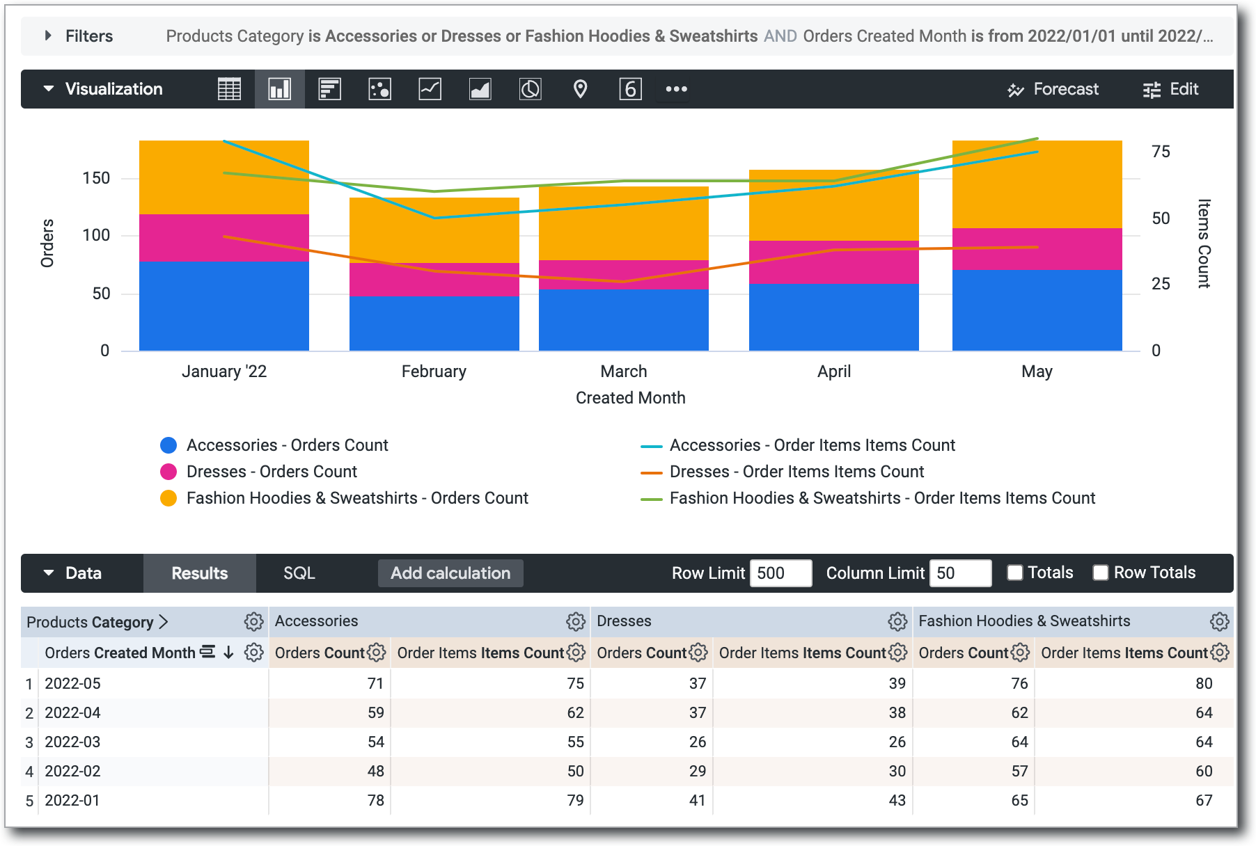 When you're visualizing pivoted Explore results, a single field is split into multiple series. For example, in the visualization that is shown in the Creating stacked charts with multiple visualization types section of this documentation page, the Orders Count field is split into three series: Accessories - Orders Count, Dresses - Orders Count, and Fashion Hoodies & Sweatshirts - Orders Count.