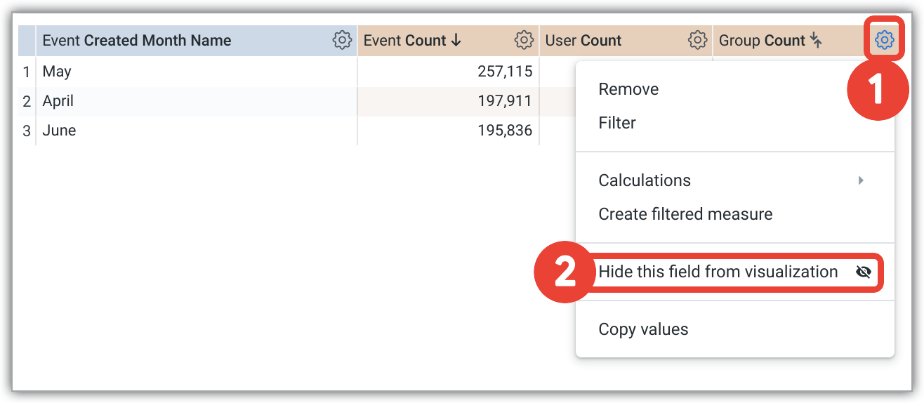 - Completely hide a field from the visualization. This is done through the column gear menu in the data table.