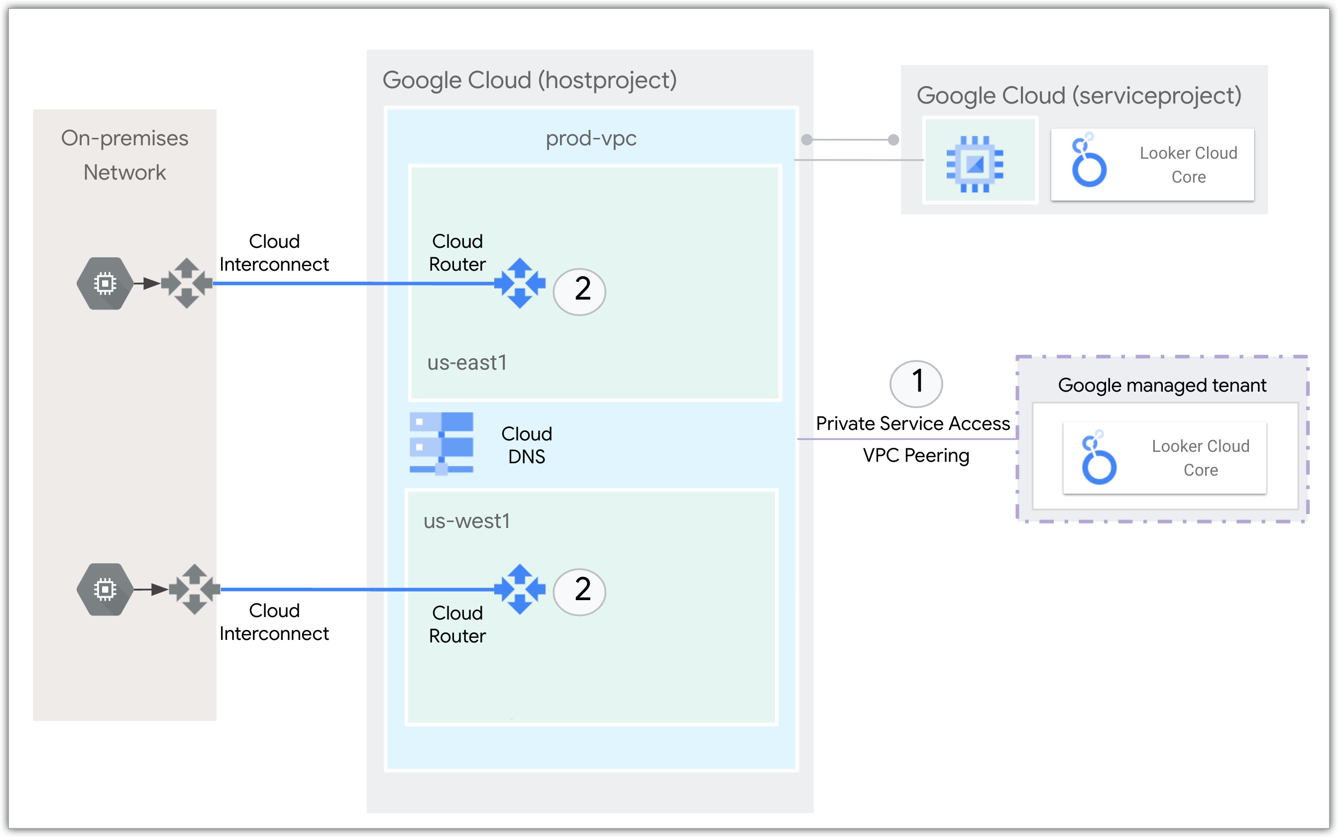 - Configure DNS Peering with the Service Networking Google Managed VPC for the Looker (Google Cloud core) instance to resolve the private hostnames.