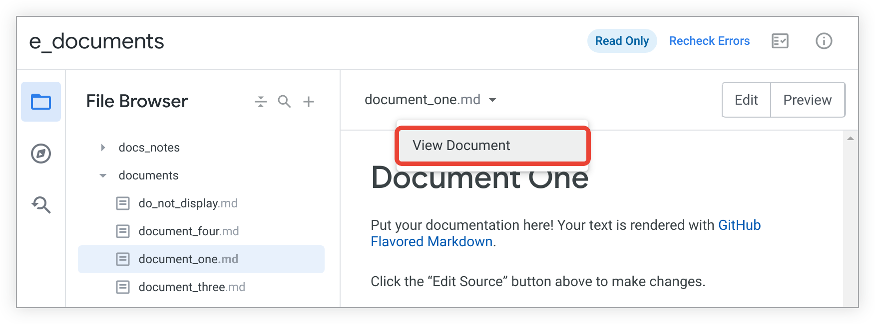 In this example, you might want to list the documents Document One, Document Two, Document Three, and Document Four in numerical order rather than alphabetical order as well as to hide the document Do Not Display from the navigation sidebar.