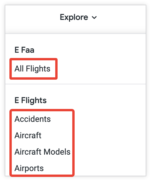 In Looker, your users can see Explores listed in the Explore menu. Explores are listed below the names of the models they belong to.