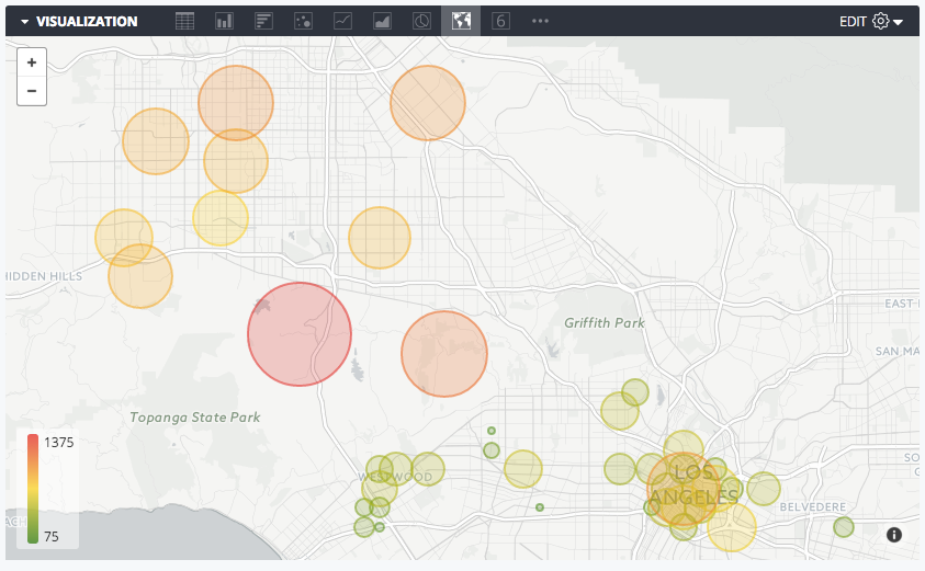 To build an interactive map chart, select the Map visualization type in the Visualization bar. You can also edit your map visualization in the visualization menu. Click the gear in the upper right corner of the Visualization bar.