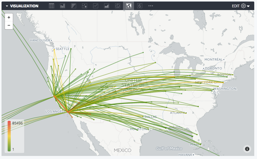 The Connect with Lines map visualization takes two fields of type:location from your query, then connects them together in the visualization. Adding a measure to the query lets you add a color scale to the lines.