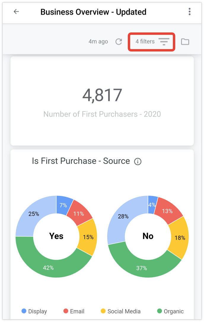 Dashboards display a filter icon and the number of filters that have been added at the top of the dashboard in the mobile app. To view the filters that have been added to a dashboard, select the filter icon or the text indicating the number of filters that have been added.
