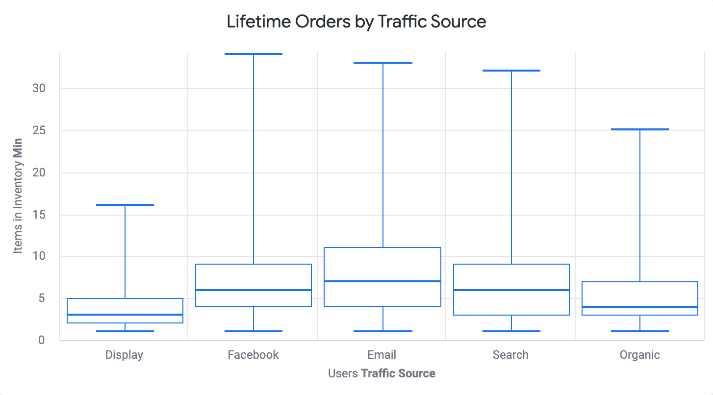 Elements of type: looker_boxplot are useful for visualizing the distribution and spread of values in your dataset. They can be especially useful for comparing values across categories. Boxplot elements require at least one dimension, along with either two, three, or five measures.