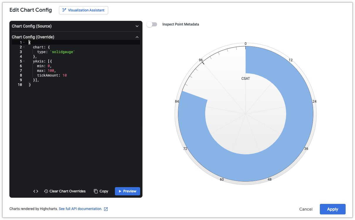 Select the Chart Config (Override) section, and enter the HighCharts JSON from the Writing the JSON snippet section of this page.