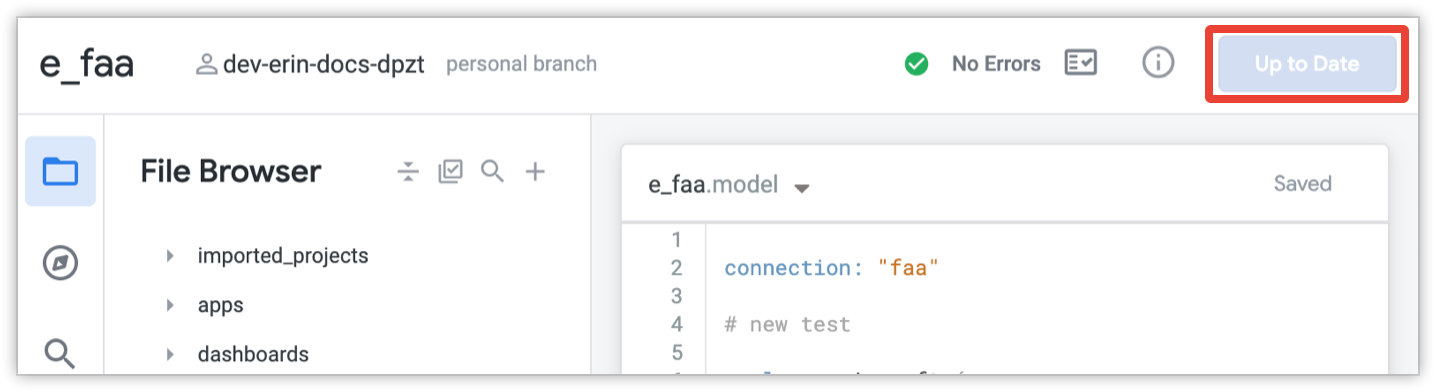 If your developer branch is in sync with the production branch, the Git button displays the Up to Date message and isn't selectable.