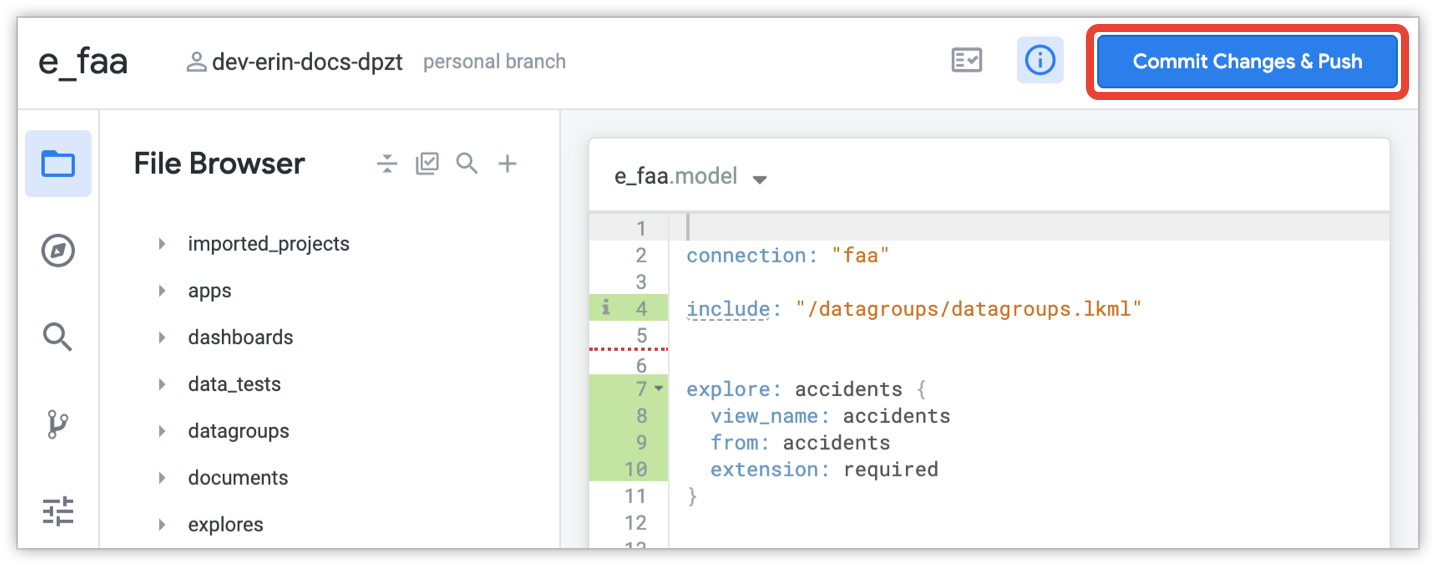 Once you save your changes (and fix any LookML warnings or errors, if required) and pull from production (if required), the Git button displays the text Commit Changes & Push.