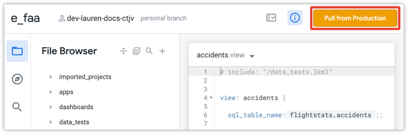If another developer has made changes to the production branch since you last updated your local branch, Looker requires you to pull those updates from the production branch. The Git button displays the text Pull from Production in this scenario.