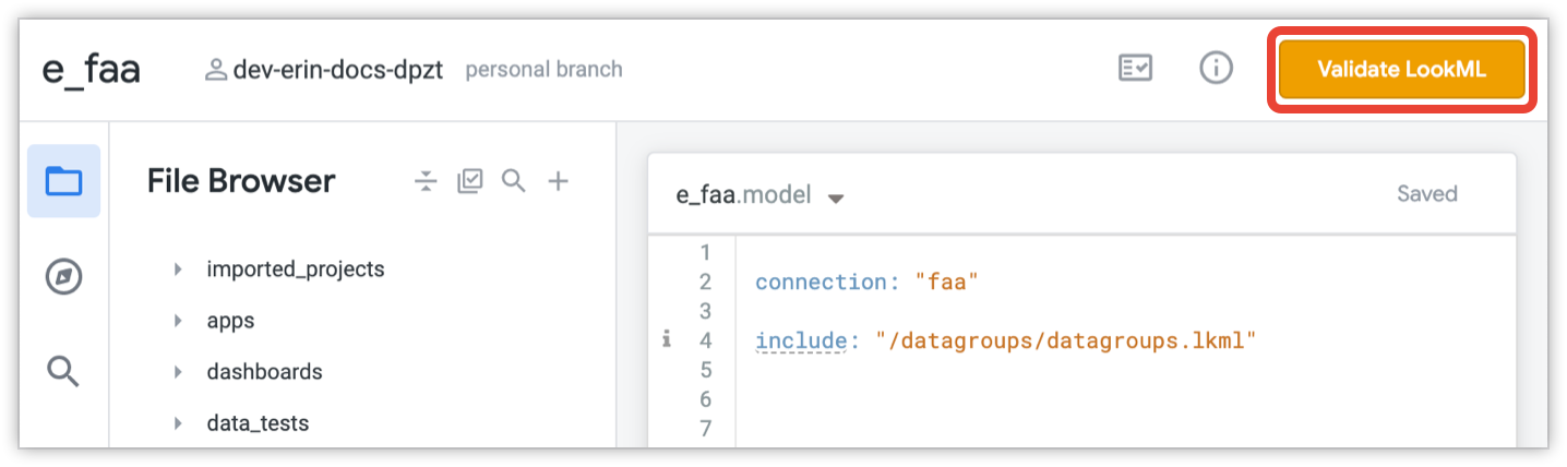 After you have made and saved any changes to your LookML project, the IDE may require you to validate your LookML. The Git button displays the text Validate LookML in this scenario.
