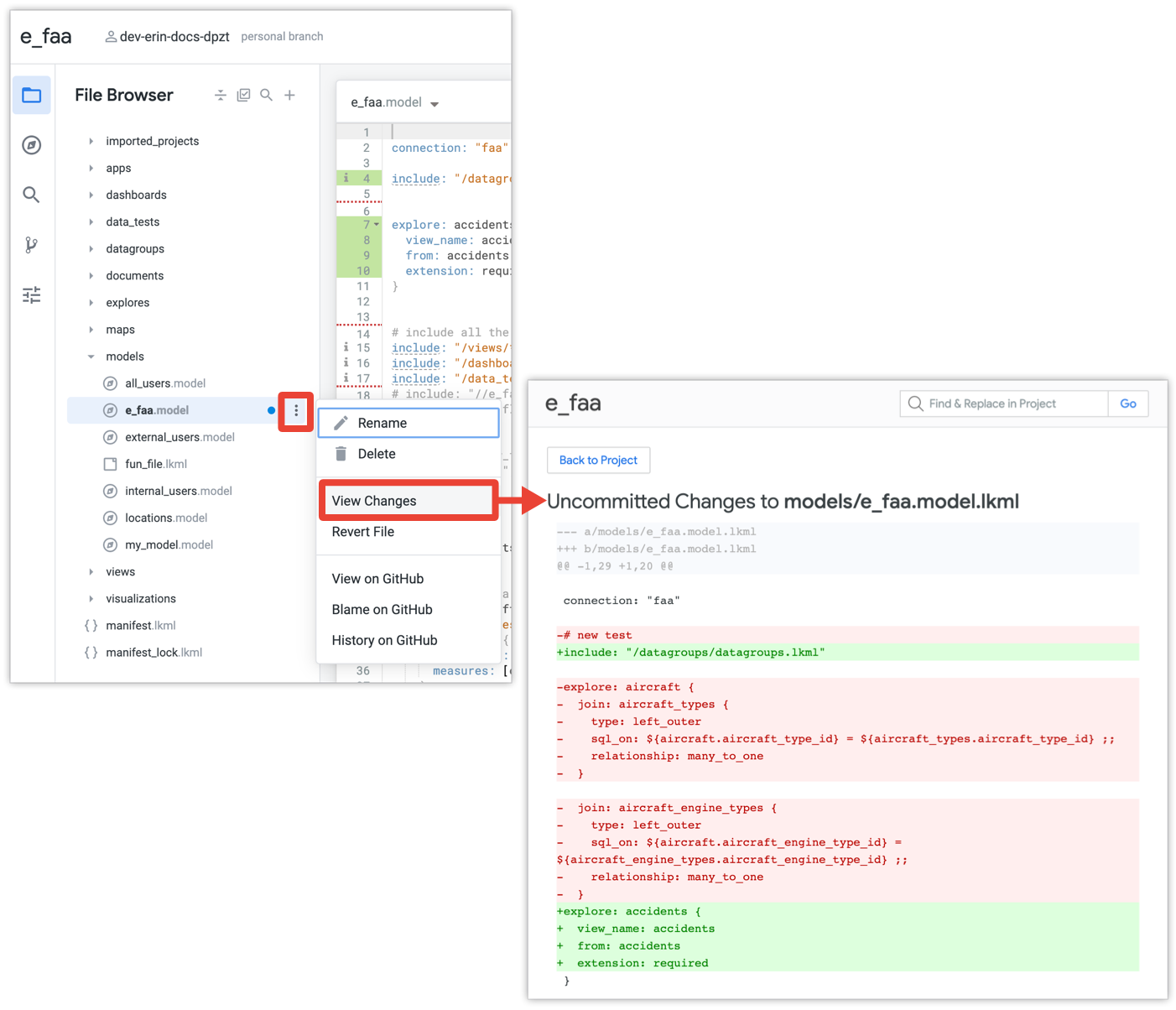 In the Uncommitted Changes to Project window, Looker displays a summary of all the uncommitted, saved changes in all the project's files. For each change, Looker shows the following: