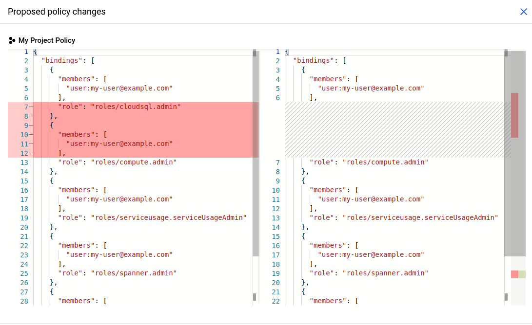 get-iam-policycommand to reflect the changes you want to simulate.There are multiple types of changes you can make to the allow policy. For example, you could add or remove a principal from a role binding, or remove a role binding from the allow policy.
