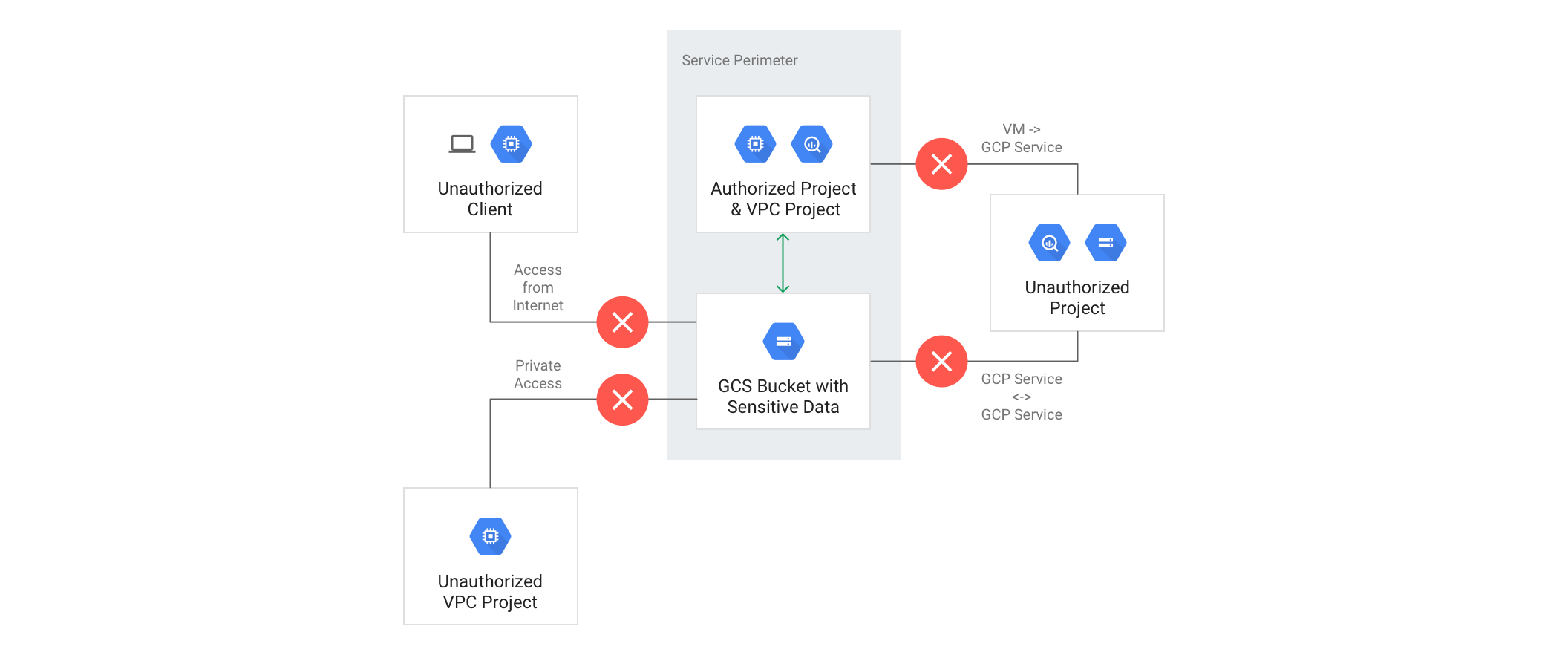 The following diagram shows a service perimeter that allows communication between a VPC project and Cloud Storage bucket inside the perimeter but blocks all communication across the perimeter: